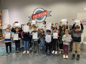 25 von 40 diesjährigen Diplomkindern waren gekommen, um in der Stadtbibliothek Ludwigshafen ihre Kinderzukunftsdiplome aus den Händen von Larysa Ludchenko und Mirjam Alberti in Empfang…