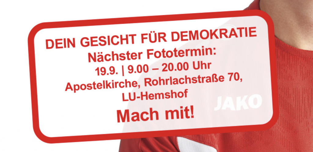 Zeig auch Du Flagge beziehungsweise Dein Gesicht für die Demokratie! Komm vorbei und lass dich vom Fotografen Thomas Brenner ins Licht setzen. In Ludwigshafen sind aktuell folgende Termine geplant: